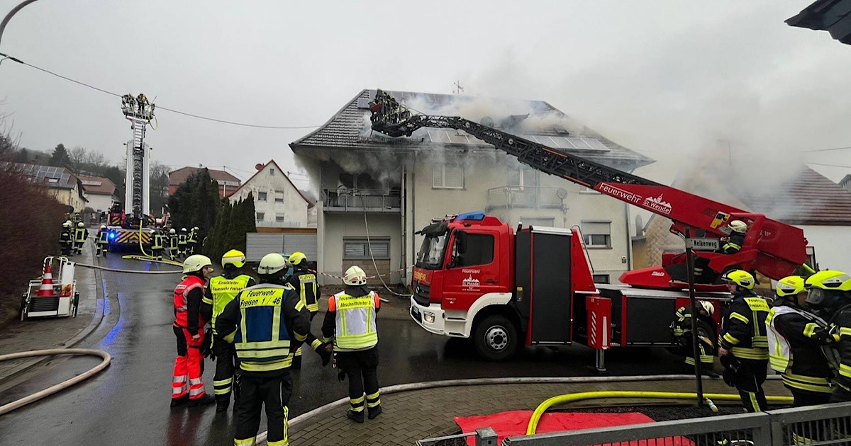 St. Wendel: Ein ausgedehnter Dachstuhlbrand hat am heutigen Sonntagvormittag im Nelkenweg im St. Wendeler Stadtteil Oberkirchen einen Großeinsatz der Feuerwehr ausgelöst. Drei Einsatzkräfte wurden dabei verletzt. Vier Bewohner des betroffenen Hauses konnten sich rechtzeitig selbst in Sicherheit bringen und blieben glücklicherweise unverletzt.