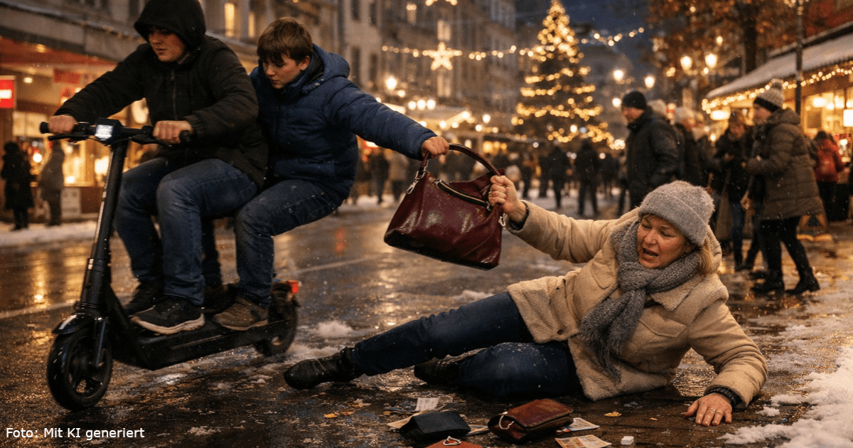 Nach bisherigen Erkenntnissen befuhren zwei 14-jährige Jugendliche gemeinsam mit einem E-Scooter die Straße und entrissen einer 56-jährigen Frau im Vorbeifahren gewaltsam ihre Handtasche. Durch das plötzliche Entreißen verlor die Geschädigte das Gleichgewicht, stürzte und zog sich leichte Verletzungen zu. In der Handtasche befanden sich persönliche Gegenstände.